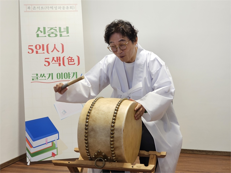 북(book)콘서트니까 북(악기)콘서트도 함께 하겠다며 나선 골목명창(?) 최용호 소리꾼. 요즘 판소리를 열심히 배우고 있다며 모든 이들을 북소리로 리드하며 창과 가요를 즐겁게 부르는 시간을 가졌다. (사진: 윤준식 편집장)