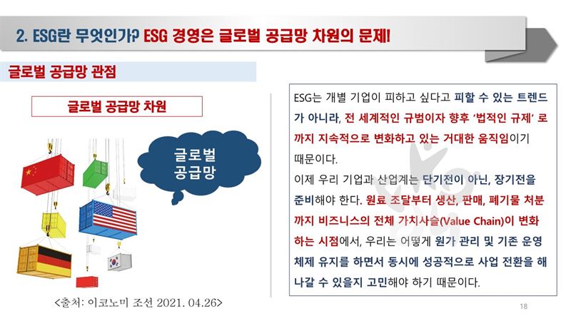바로 앞에서 “글로벌 공급망 관점이라는 것이 되게 중요한 의미가 있다”고 얘기했잖아요. 우리나라가 글로벌 공급망 차원에서 피할 수 없는 것이 ESG 경영이라고 보시면 될 것 같아요. 글로벌 공급망 차원에서 바라 볼 때 원료 조달부터 생산, 판매, 폐기물 처분 등 전 비즈니스 전체 영역에서 ‘가치사슬(value chain)’ 관점에서 관리해야 합니다.