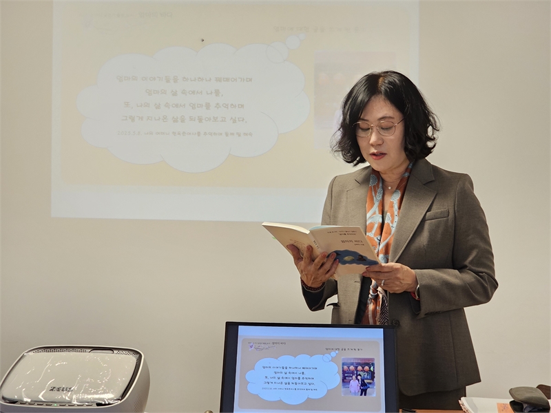 『엄마의 바다』강혜숙 작가는 엄마와의 추억을 풀어냈다. 저술 계기는 드라마 『폭삭 속았수다』 덕분이다. 드라마를 보며 해녀였던 엄마의 사연이 겹쳐 보여 많이 울게 되었고, 결국 엄마의 이야기를 쓰기로 결심했다. 출장 때문에 기차를 많이 이용해야 했는데, 기차를 기다리는 시간을 집필 시간으로 잡았다. 매번 부산역 파리바게트를 집필 공간으로 이용했는데, 빵 쟁반에 까는 유산지를 버리지 않고, 자필로 초고를 쓰곤 했다. “생각지도 못했던 옛날 기억들이 손을 따라 흘러나왔다”며 엄마의 이야기를 통해 ‘Well-dying; 품위 있는 죽음’이라는 주제를 잘 풀어냈다.