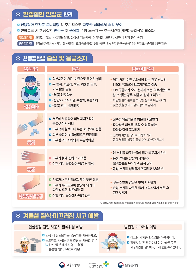 한파주의보 발령 시 작업 시간대를 오전 6시에서 9시로 조정하고, 한파경보 발령 시에는 옥외작업을 최소화하도록 지도할 방침이다.